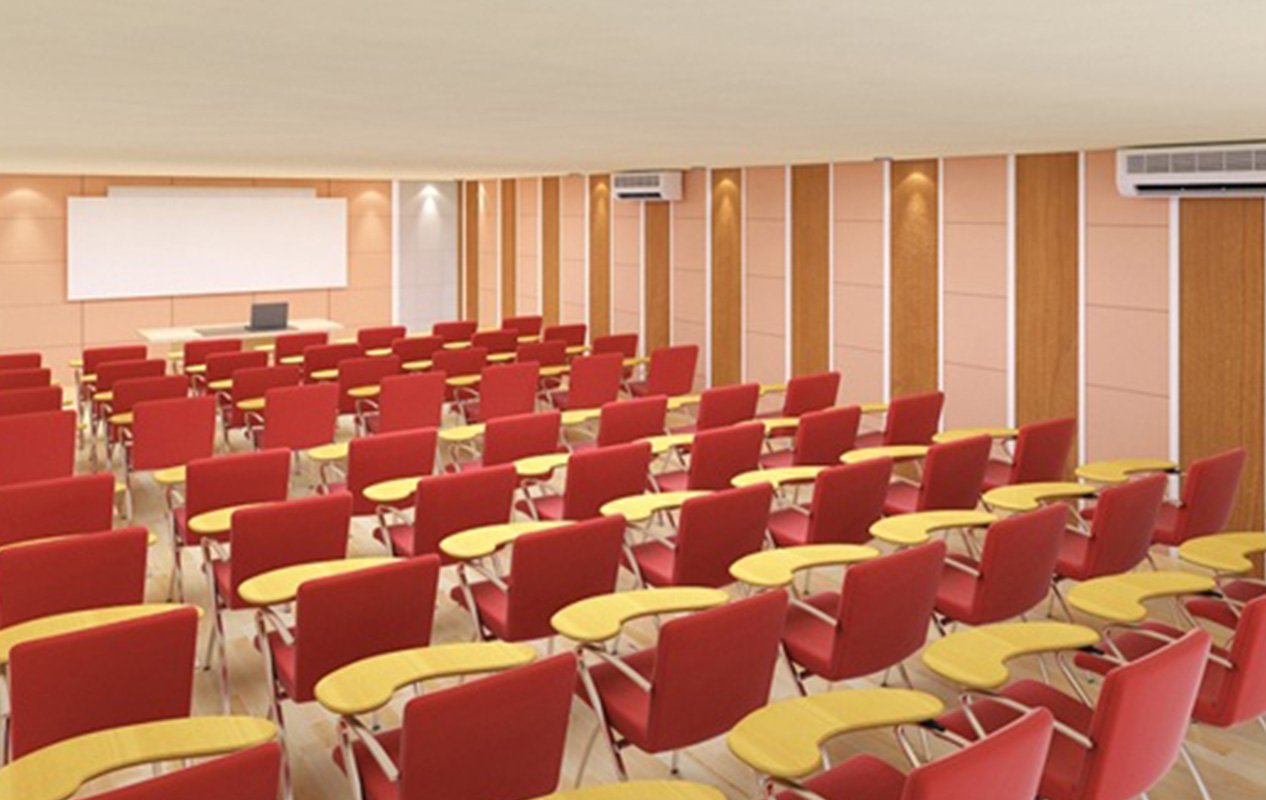 Two long seminar halls are located adjacent to the main auditorium. The primary function of these halls is to conduct parallel events during international conferences. Hence, greater care has taken to eliminate the sound transmission between the two halls and also between the seminar halls and auditorium. Side wall panels are blended with appropriate absorptive and reflective treatment to cater live programs, recording, to host virtual programs and also to telecast the recorded events.